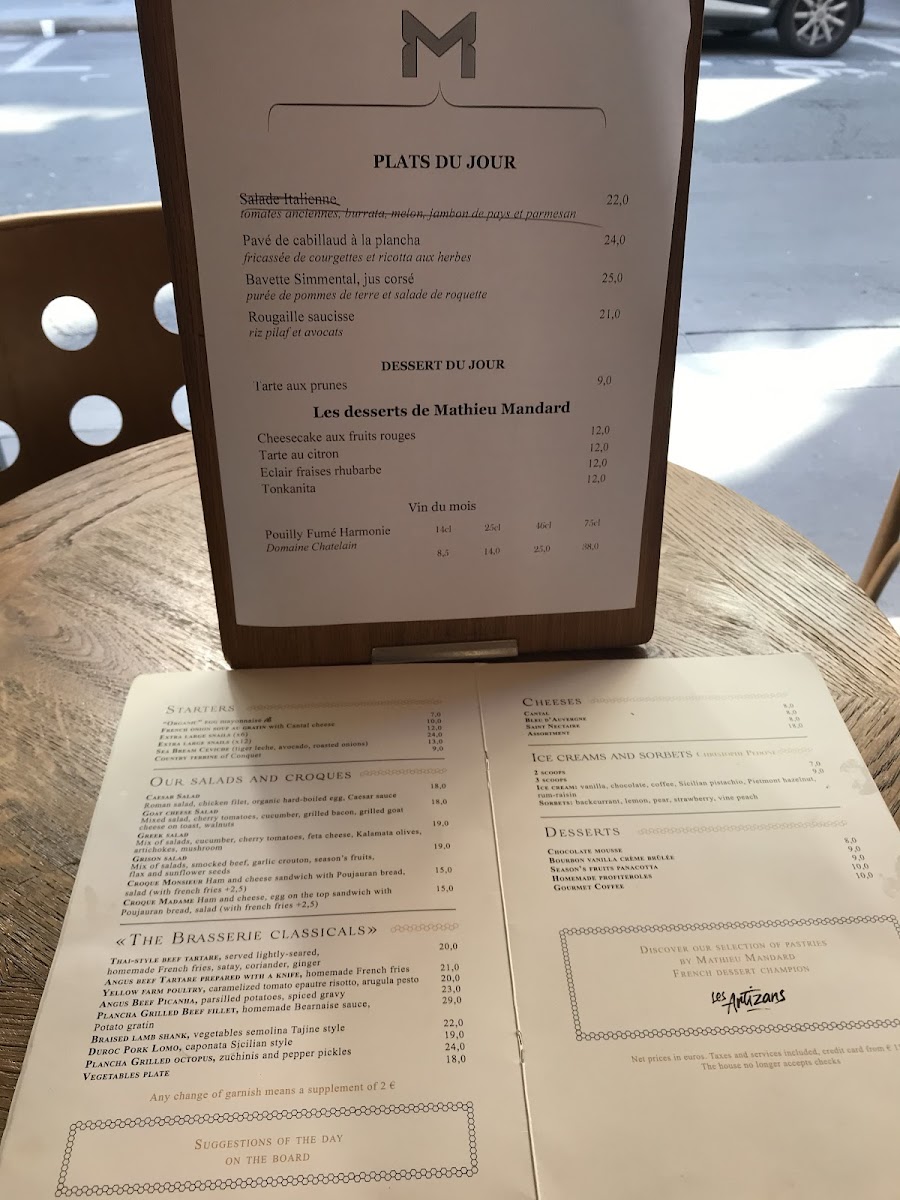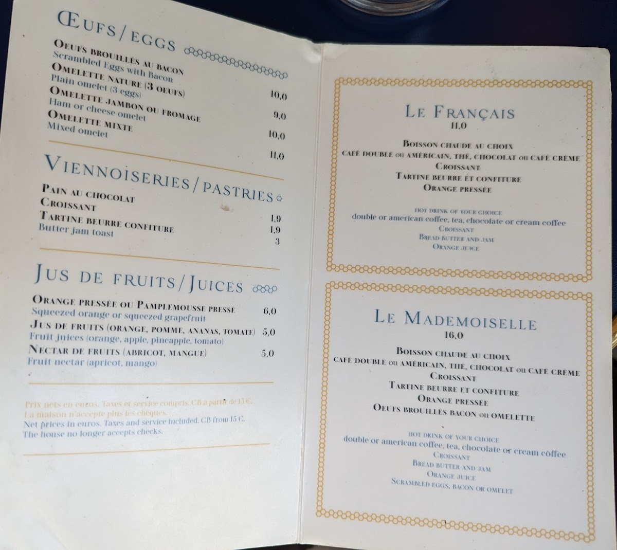 “ Great breakfast here on Saturday. Scrambled eggs and bacon, bread and jam, croissant, pressed orange juice and coffee. Great value, lovely staff and a very Parisian feel. We will be back next year. ”